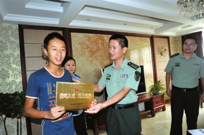 为激发军校和国防生荣誉感使命感,进一步营造“一人从军,全家光荣”的浓厚氛围,咸安区人武部为2015年度军校和国防生新生家庭送上“携笔从戎、无上光荣”荣誉牌。图为该部杨亚斌政委为华中科技大学国防生陈哲钦家庭送上荣誉牌。 通讯员 陈钦摄