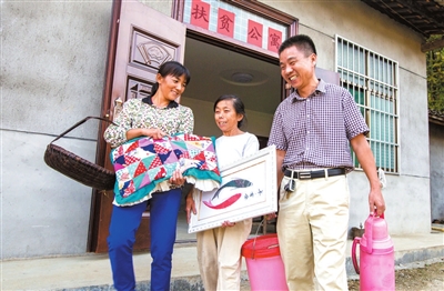 9日,通山县闯王镇坳坪村村干部正在帮助孤寡老人徐爱想移居到该村刚建好的扶贫公寓。据了解,该村积极争取资金兴建扶贫公寓,将村里孤寡老人分批移居到公寓,公寓所有权属村委会,可以循环使用。