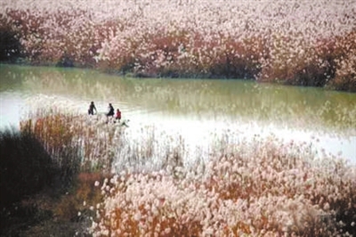 行走于岸边,暖暖的阳光下,弯曲的河道里,芦杆如箭,排列成行,芦叶碧绿,轻卷成哨,芦苇花迎风招展,游客的歌声远远传来。