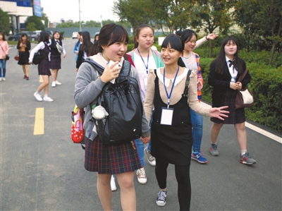 10月13日,咸宁高中学生朱思琪(前排右)陪同韩国学生李美林(前排左)参观校园。这是韩国江原道太白市长省女子高中师生代表团一行11人对咸宁高中进行访问交流。