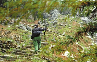 每块砖、每片瓦、每粒砂,都得肩挑背驮。建筑材料先用船运到渡口,再分装到自行车或板车运至山下,再扛至村子,运输成本高于材料成本。楠竹木材等只能通过摩托车或人力往山下运输。