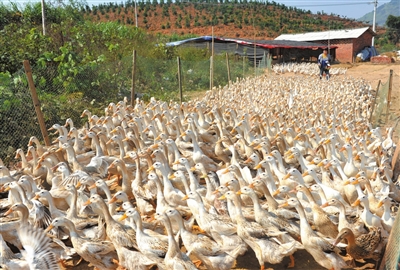 10月21日,通山县燕厦乡北冲村种养殖基地,成群麻鸭被赶往水池。养鸭户成纯佑借助村集体鱼池,养殖6000只蛋鸭,高峰期每天产鸭蛋5000多枚。