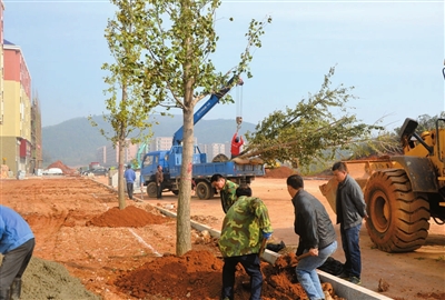 目前,已对5条主要道路进行了绿化,一路一特,新栽银杏树、桂花、枫香、香樟、栾树、鹅掌楸等近3000棵,铺草皮4400平方米。
