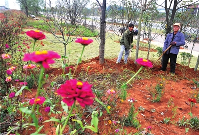 5日,咸嘉一级公路两侧绿化带,工人正在补栽树木。高大的树木、碧绿的草坪、娇艳的花朵,42个品种的植被将咸嘉一级公路妆点得十分美丽,让路人赏心悦目。 记者 陈红菊 特约记者 胡剑芳 摄