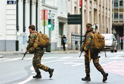 11月21日,比利时军人在首都布鲁塞尔市区巡逻。比利时当日凌晨将布鲁塞尔首都大区的安全警戒级别提升至最高的第4级,这意味着面临“严重而即将发生的”恐怖威胁。 据 新华社