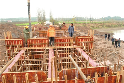 | 工人们浇筑桥墩 |
