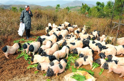 3日,崇阳县白霓镇浪口香猪生态养殖基地,饲养员吹响口哨,一头头巴马香猪从山林各处跑来进食。