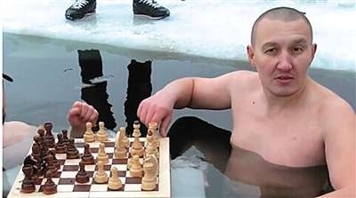日前,两名俄罗斯男子泡在叶卡捷琳堡市境内已冰冻的沙塔什湖中下国际象棋,让人们再次对这个战斗民族充满了钦佩。时值冬季,沙塔什湖已结冰,但这并不能阻止结实耐寒的俄罗斯人。他们脱得只剩内裤,跳进冰水之中进行棋盘上的“厮杀”,没有丝毫的犹豫。 (本报综合)