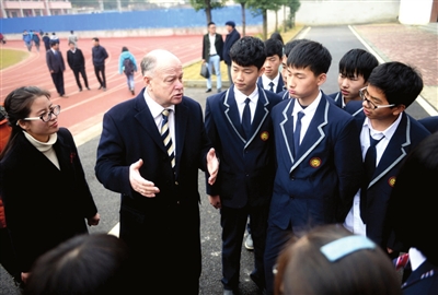 14日,莫斯科国立大学校长助理叶甫盖尼在咸安区横沟高中,与学生进行俄语交流。