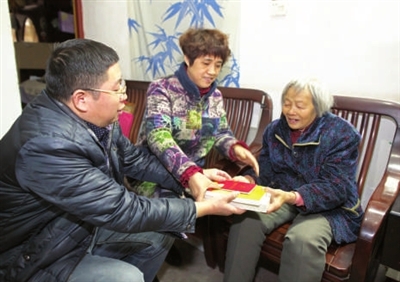 22日,咸安区永安办事处工作人员刘向南和刘冬云来到全国劳模、退休老党员张三桃家中,送上十八届五中全会学习资料。