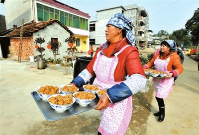 将近中午,空气里渐渐弥漫着肉香。一碗碗农家土菜被一一端上桌,玩了一上午的游客坐上餐桌,大快朵颐,满嘴留香。