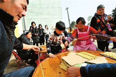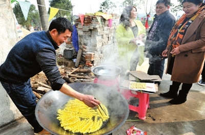 炸麻花是村里人过年必须准备的一道美食。村民蔡细顺家门前支起了两个大圆桌,蔡细顺正和其他村民一起搓麻花。不少在旁边看稀奇的小孩子也跃跃欲试。