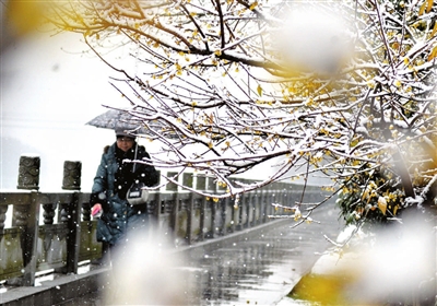市民纷纷走出家门拍照留念,享受着今冬首场雪的美景。