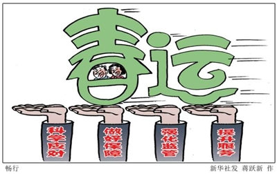 今年春运期间,交通运输系统着重强化了各种运输方式的协同配合。一是加大运力供给,让旅客乘坐不同运输方式衔接时更省心、省力、省时。二是加强城市内外的运力衔接。科学安排轨道交通、公共汽电车和出租汽车运力,提升旅客“最先和最后一公里”出行效率。三是加强城乡间的运力衔接。针对春运期间农村地区探亲访友、集市庙会较为集中等情况,积极发展城乡公交、镇村公交,增开农村客运班车,切实方便农民进城、市民下乡。