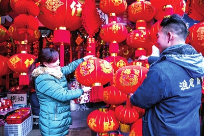 春节临近,赤壁市新春年货市场销售红红火火。商家纷纷在店铺前挂起大红灯笼、中国结、年画等新春饰品,迎接春节的到来。