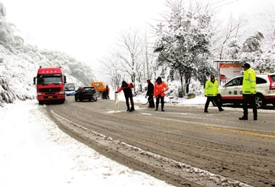 三部门通过错时巡查、交叉巡查、联动巡查等方式,对该路段进行全天候不间断巡查,及时消除安全隐患,疏导滞阻车辆,清除被积雪压倒在公路两旁的竹桠,并撒盐化雪防止道路结冰,全力保障境内公路安全畅通。 通讯员 汪建芳 摄