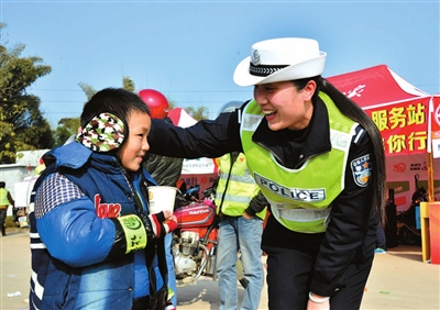 1月30日,在广西贺州市羊角山春运服务站,一名女交警给随父母骑乘摩托车返乡过年的8岁男孩陶振宇戴上御寒护耳。