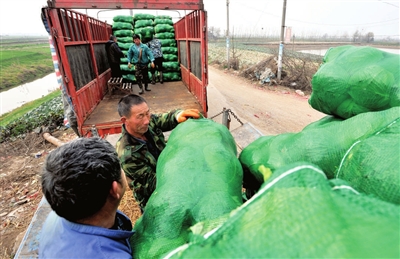 16日,农历正月初九,嘉鱼县簰洲湾镇复阳村,菜农正将包菜装车。
