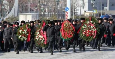 2月23日,在俄罗斯符拉迪沃斯托克,俄罗斯军人向烈士纪念碑献花。当日是俄罗斯的祖国保卫者日。俄罗斯远东城市符拉迪沃斯托克举行了各种纪念活动,当地居民、军人、学生向烈士纪念碑献花,市中心广场举行武器展和文艺演出,军人还向当地居民免费发放粥、面包等部队食物。 据新华社