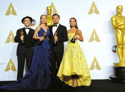 28日,第88届奥斯卡颁奖典礼在洛杉矶举行。最佳男配角奖得主马克·里朗斯、最佳女主角奖得主布丽·拉森、最佳男主角奖获得者莱昂纳多·迪卡普里奥和最佳女配角奖得主艾丽西亚·维坎德(从左至右)手捧奥斯卡奖杯合影。 据新华社