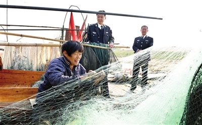 1日,在鱼岳镇清水沟渔港内,渔民们正在清理网具,打包入库。嘉鱼县水产局局长熊仕秀正率领执法人员巡视渔船归港情况,宣传新的政策。