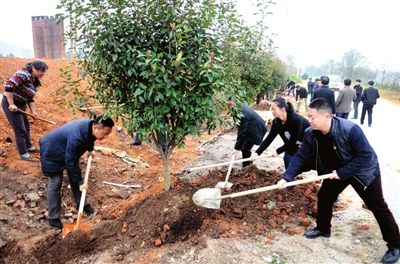 8日,崇阳县白霓镇干部群众在油市村种植石楠树。