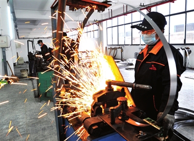 9日,赤壁市经济开发区,湖北三盛刀锯有限公司刀带车间,工人们正在对环形刀进行接缝加工。