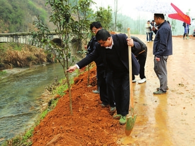 本报讯 通讯员佘建兰报道: 3月23日,市中院党组书记、院长刘太平带领机关干警到“三万”驻点村通山县洪港镇杨林村开展义务植树活动。