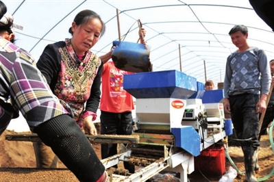 ▲3月25日,通山县大路乡集中育秧基地水稻机播流水线上,农户们正忙着向秧盘内填土、撒种。该基地占地面积15亩,建有12个育秧大棚。此次春耕备耕,基地将设秧盘18000多个,所产早稻秧苗可种水田1000余亩。记者 程慧 通讯员 夏有杰 摄