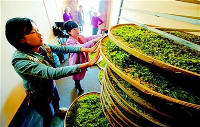 3月28日,宜昌点军区土城乡落步淌村,茶农们出售刚采摘的鲜茶叶。落步淌村位于交通不便的高山地区,点军区通过“公司+合作社+农户”的合作模式,让村民以土地入股,参与茶园规模化、产业化经营,整合精品茶园380亩,带动近百户村民通过种植茶叶脱贫。