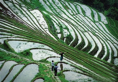如今,梯田不仅是生存的载体,更已经成为一种独特的旅游资源,被称为“地球上最美的曲线”。尤其春天,站在山顶放眼望去,形状各异的大小梯田盛满清泉,纵横交错的田埂如蛛丝一般,农民们犁田、砌埂、削壁、灌水, 一个个身影点缀在如镜般的梯田水面上,构成了一幅秀丽壮观、生机盎然的田园山水画卷。