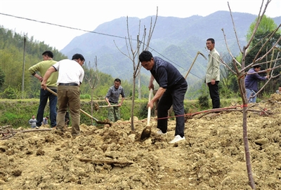 图为该村党员群众一起栽种果树。