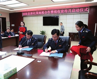 三是要强化责任上肩。一个和尚担水吃,三个和尚没水吃,尽管是一个古老的故事,但其寓意很深刻。第一完善合作机制。全县税务部门要以推进联合服务为突破口,合力攻坚、相互交流,以“互派、共驻、共建”办税厅、国地税业务一个窗口办理、联合网上办税、联合开展纳税信用等级评价等措施为基础,深化办税服务合作,不断提高办税服务质量,让纳税人和人民群众有更多获得感。第二实现资源共享。要充分利用综合治税平台,加强与财政、工商、统计、住建等部门的信息交换、共享及分析,不断提高税收控管水平,实现经济与税收协调增长。第三强化责任担当。两家联合办税,合作肯定有一个协调和磨合的过程,希望同志们要以大局为重,以崇阳发展为重,坚持部门利益服从全县改革发展大局,牢记承诺与使命,勇于担当,主动作为,忠实履行各自在合作协议中的职责。这里要强调一点,如果在合作中敷衍塞责,造成工作被动甚至造成国家税收流失的,将严格追究责任。