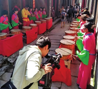 图为栏目组记者在羊楼洞明清古街拍摄国家级非物质文化遗产——脚盆鼓表演现场。