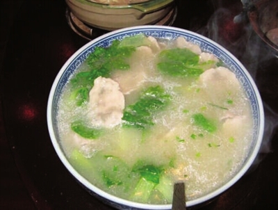 捶好了肉片后,下一道工序与我们平时在家做肉片汤没什么差别:先把水烧至滚开,把肉片及青菜下到锅里,然后依次放进猪油、酱油、鸡精、胡椒、少许盐,汤起锅后,撒上葱花,一锅“捶肉汤”就做好了。