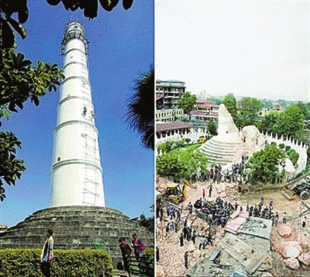 其中,180多岁的比姆森塔是尼泊尔主要地标之一,在地震中倒塌。这是以尼泊尔抗英民族英雄比姆·森·塔帕的名字命名的。比姆·森生前曾筑高塔两座,另一座已于1834年大地震时倒坍,此塔则经受了两次强烈地震考验。1934年大地震时,塔附近的房屋倒毁殆尽,而它却安然无恙,保存完好。不过,最终还是难以幸免。