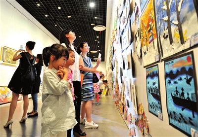 7日,市博物馆三楼展厅,市民带着孩子在观看少儿美术展。