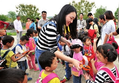 4日,咸安区横沟桥镇鹿过村小学,市建工处青年党员正给学校里的留守学生发书包和玩具。市建工处将“主题党日+”与“五四”结合,青年党员们度过一个有意义的节日。记者 夏正锋 通讯员 廖朝阳 摄