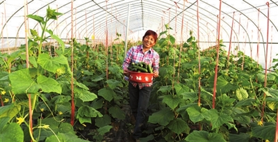5月4日,在嘉鱼县新街镇港东村生态果蔬种植专业合作社蔬菜大棚里,一贫困户正在采收迷你黄瓜。