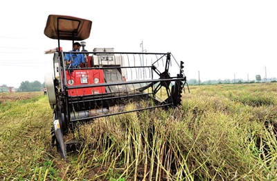 10日,嘉鱼县鱼岳镇陆码头村,当地农户租用大型收割机抢收油菜。