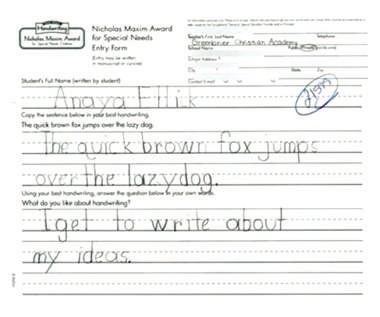 美国维吉尼亚州一名没有双手的7岁小女孩,日前打败其他50个对手,在全美写字比赛中获得了冠军。