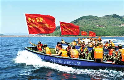 11日,咸安区桂花镇金桂湖,市消防支队官兵正在湖面进行冲锋舟抢险演习。