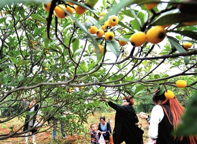 10日,嘉鱼县高铁岭镇白果树村嘉华果园,三五成群的游客正在园中采摘刚刚成熟的枇杷。