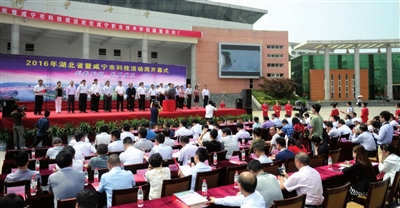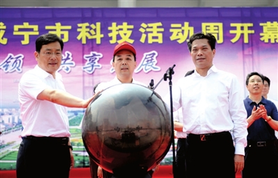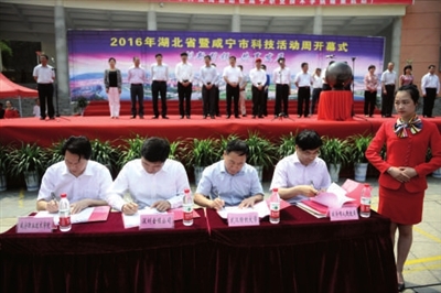 5月13日,2016年湖北省科技活动周启动暨咸宁市政产学研合作签约仪式在咸宁职业技术学院举行。省人大常委会副主任周洪宇,市委书记、市人大常委会主任李建明,市委副书记、市长丁小强出席并共同启动“科技之光水晶球”。