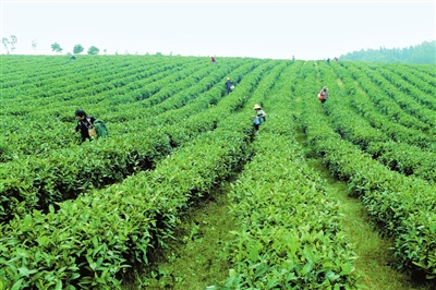 昨日,在通城县沙堆镇茶叶种植基地,湖北福人九井峰茶业公司员工在采茶。