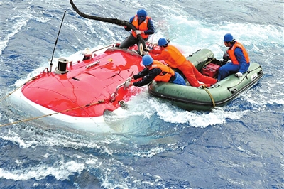 5月22日下午,乘坐橡皮艇的人员为浮出水面的“蛟龙”号载人潜水器挂上缆绳。当日,“蛟龙”号载人潜水器成功完成在雅浦海沟的最后一次科学应用下潜,最大下潜深度达6579米。 据新华社