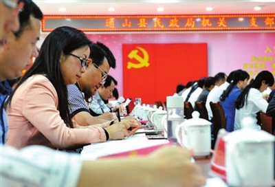 在通山民政局,与会党员就城市福利院推行“公建民营、医养结合”的模式专题学习讨论;