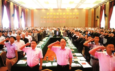 在官桥镇官桥村,88名党员胸戴党徽、身带党章,在党旗下高举右手,重温入党誓词;
