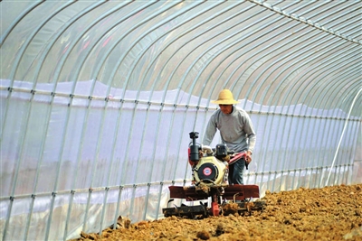 15日,崇阳县青山镇大坪村,困难户代楚军正在大棚内翻耕土地,准备移栽菜苗。