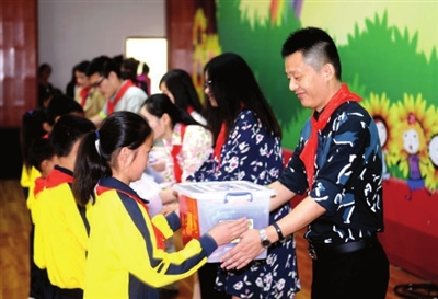 ③5月30日,在市外国语学校,湖北科技学院、市人行、市供电公司等部门向全市各地留守儿童代表送上书包和学习用具。
